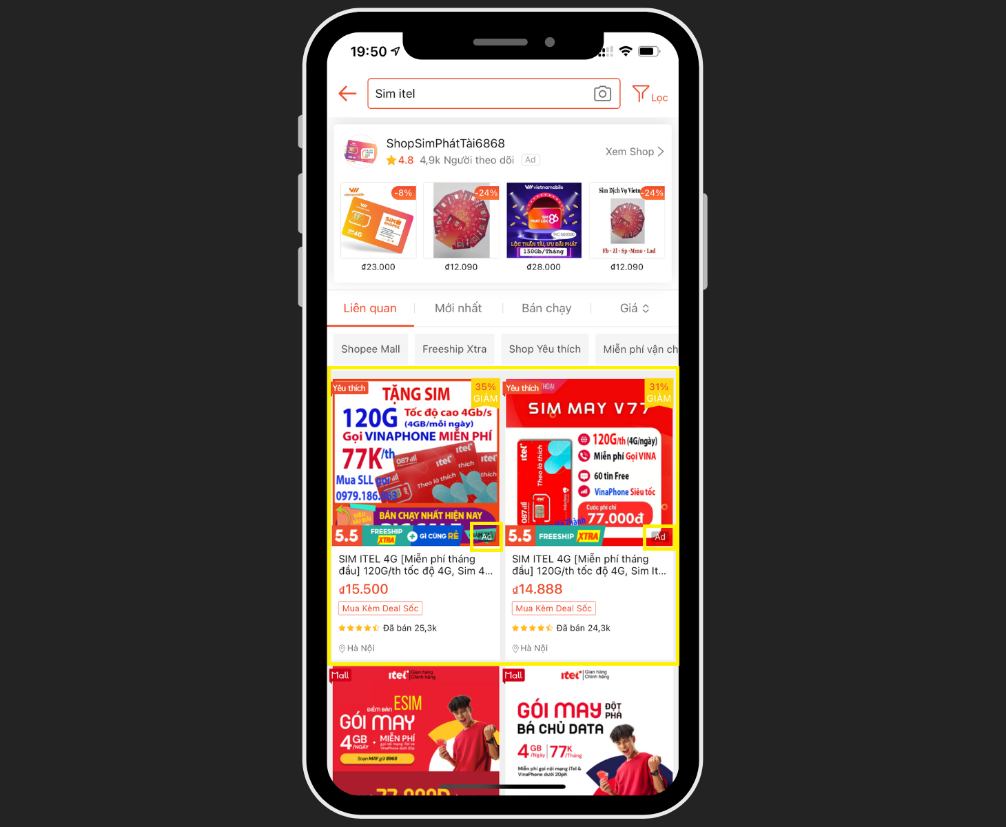 E-commerce search là: Quảng cáo Tìm kiếm Sản phẩm, quảng cáo sẽ hiển thị và đẩy sản phẩm của Shop lên đầu trang kết quả tìm kiếm Vị trí hiển thị: Quảng cáo hiển thị trong danh mục liên quan