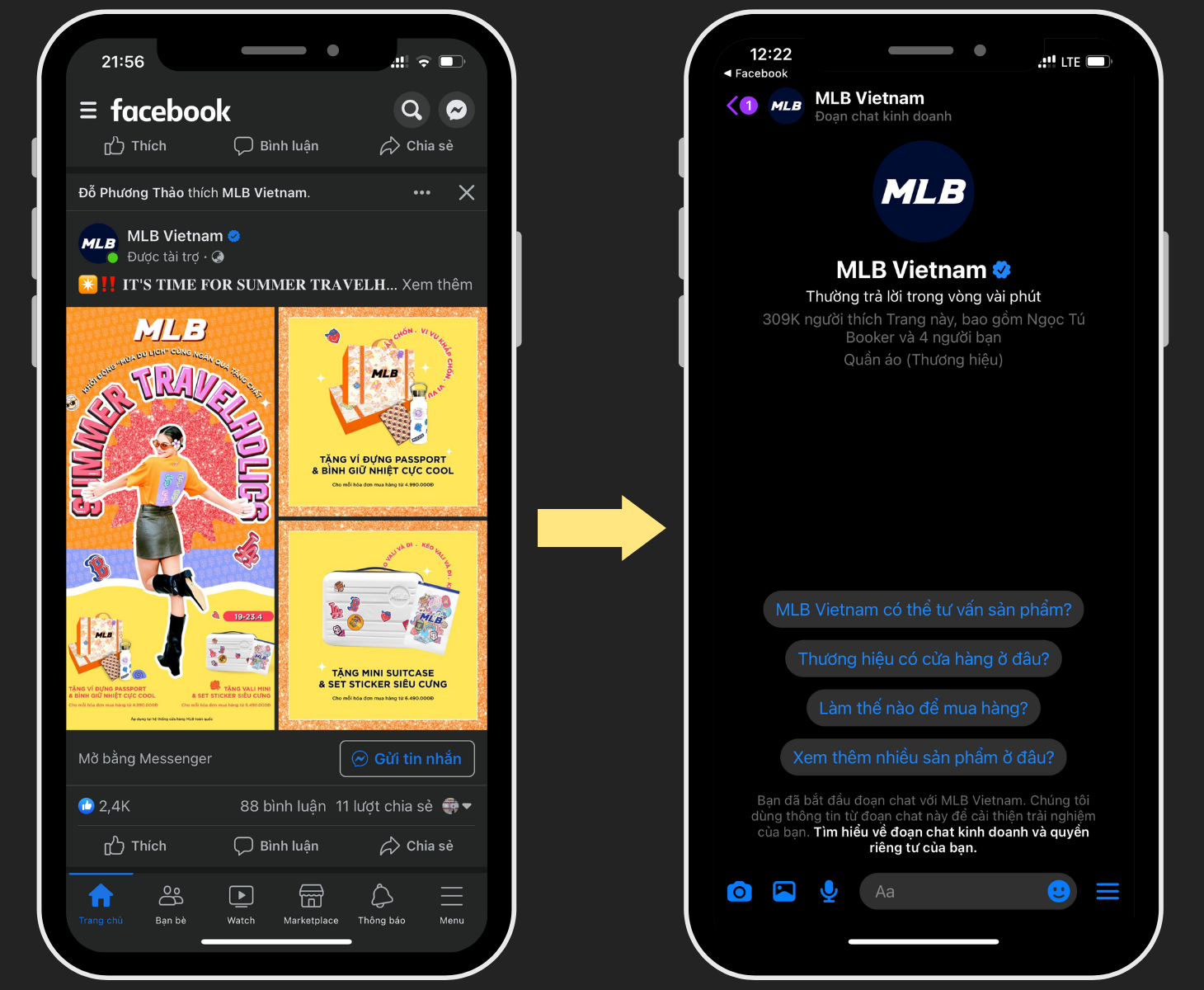 Facebook Messenger Ads: Hình thức quảng cáo này sẽ cho thương hiệu cung cấp một cách tổng quan về những sản phẩm/dịch vụ mà họ muốn tiếp cận khách hàng. Không chỉ là một bức ảnh nói về một món hàng hay dịch vụ nào đó mà quảng cáo này có thể đăng tải một chuỗi liên tiếp tối đa 10 ảnh/ video cùng những mô tả chi tiết cho một dịch vụ nào đó.